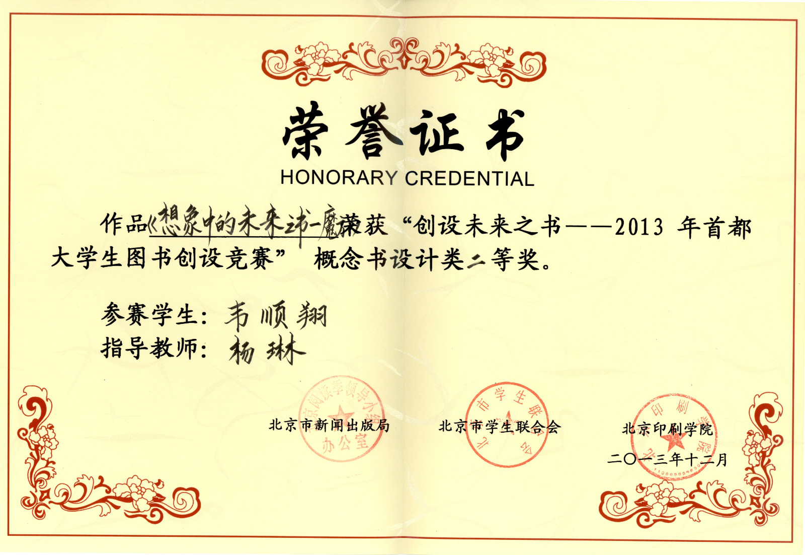 在刚刚结束的“创设未来之书”——2013年首都大学生图书创设竞赛活动中,我校建筑与城市规划学院工业设计专业10级学生韦顺翔荣获了本次大赛的二等奖。