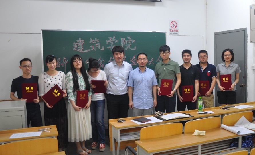 建筑学院于2014年6月6日下午在教四205举行了学院研究生会换届大会,大会选举了学院第九届研究生会主席团成员。建筑学院党总支副书记丁奇出席并致辞,大会由研究生辅导员李小虎老师主持,共有四十多名研究生会成员参加。