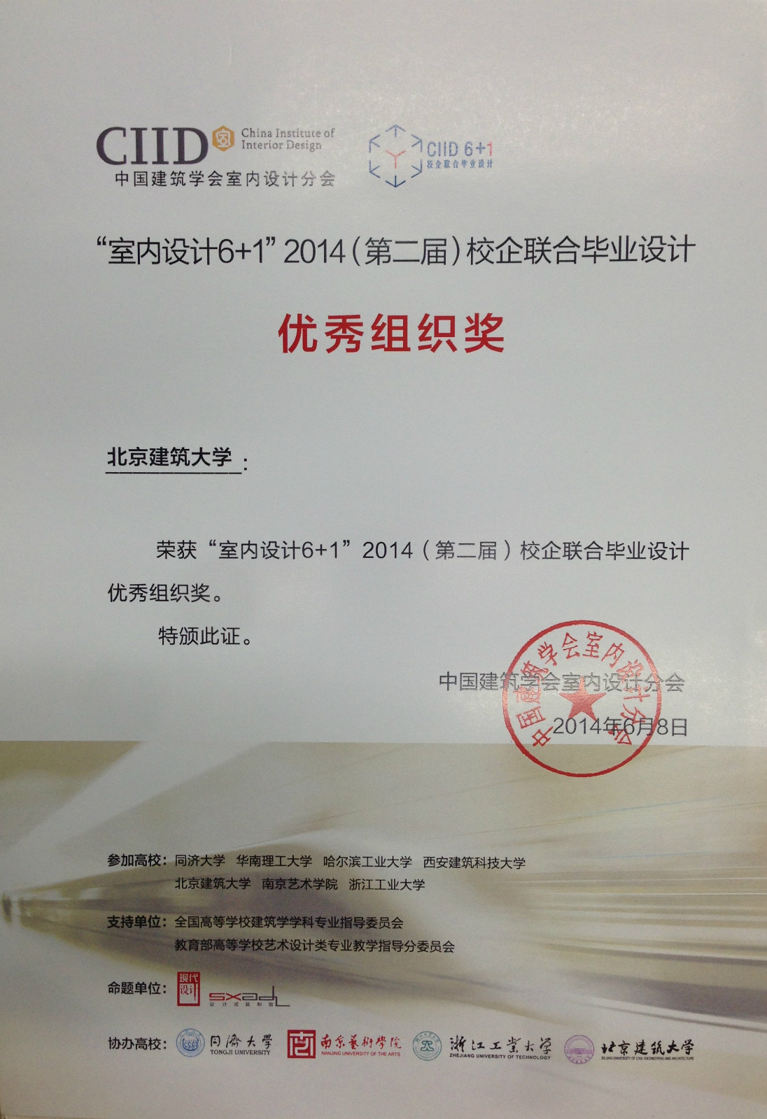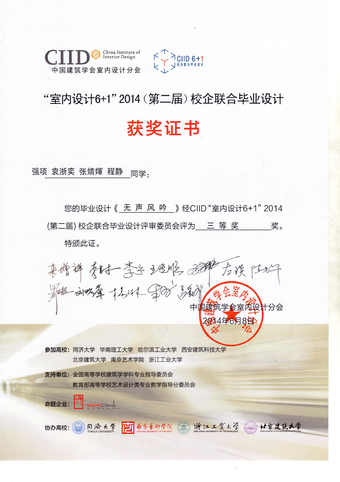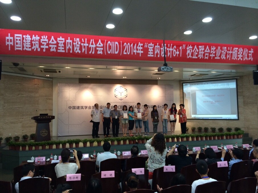 2014年6月8日, 中国建筑学会室内设计分会CIID 2014(第二届)“室内设计6+1”校企联合毕业设计答辩和颁奖活动在浙江工业大学屏峰校园举行,来自同济大学、华南理工大学、哈尔滨工业大学、西安建筑科技大学、开云电竞pg软件、南京艺术学院、浙江工业大学的七所高校,涉及建筑学、环境设计、工业设计和展示设计多个专业的50多位应届毕业班学生共计23组设计方案,经过长达3个多月的思考及创意历程,均在最终答辩及展览中呈现了完整并各具特色的设计作品。专家评委组组长、同济大学来增祥教授为本届活动做了总结与点评。评委会最终评选出一等奖4名,二等奖8名,三等奖11名。