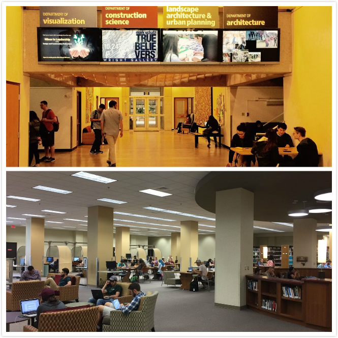 上图:建筑学院入口,下图:校图书馆阅览区