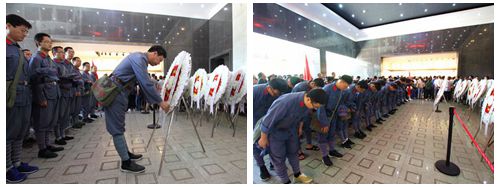 在井冈山革命烈士陵园,学员们在汉白玉无字碑前敬献花圈,张启鸿整理挽联,全体学员鞠躬献礼,默哀吊唁。