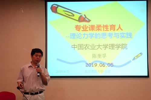 在6月5日的专题培训会上,中国农业大学教授、博士生导师陈奎孚以《专业课柔性育人——理论力学的思考与实践》为题,就专业课与育人的关系、专业课无痕揉入教书育人理念、柔性嵌入德育元素等话题,以理论力学课程为例分享了自己的思考与实践,并以“质点动力学”一节,具体展示了理论力学教学中德育功能的发挥。