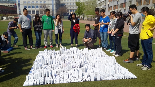 林立的楼宇,纵横的街巷,都是我们研究的主体。在巨大的城市模型前,建筑学院范霄鹏、魏菲宇两位老师,或蹲或站,正在指导学生运用“四度空间”进行数据抽象的类城市空间规划设计课程实践。