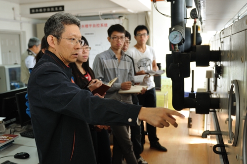 低矮、狭小的楼宇顶层是环能学院供热、通风及空调工程专业《专业认识实习》课程的教学现场之一,郝学军老师正在中法能源中心为08级本科生进行现场教学,如今照片中的学生已经进入设计院、燃气集团等行业单位工作。