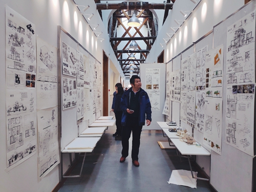 百余幅《建筑设计》课程结课作品布满了教学五号楼走廊两侧墙面,不知范霄鹏老师在这里已经踱了多少个来回,在每一个作品前驻足观评,并不时地做着记录。在您一针见血、风趣幽默点评中,我们知道,每一张画稿都已深深印入了您的脑海。