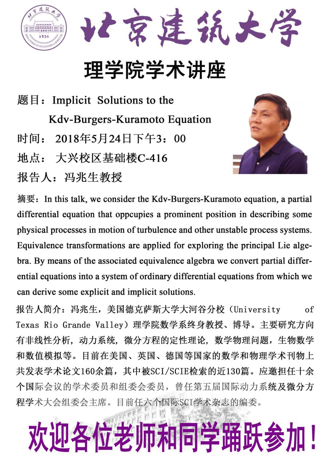 学院公告 学院公告 您当前的位置: 首页» 学院公告 理学院学术讲座——Implicit Solutions to the Kdv-Burgers-Kuramoto Equation 供稿: | 审核: | 摄影: | 发布日期:2020-04-23