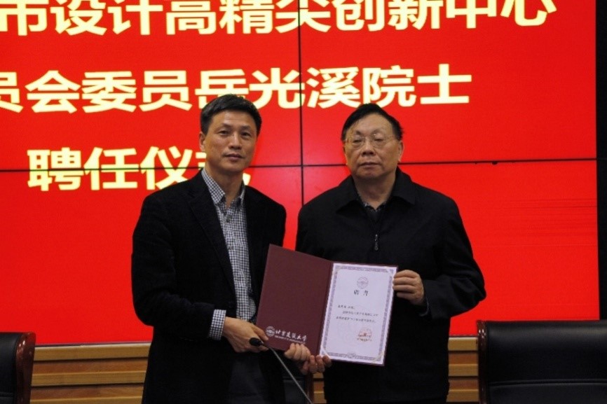 副校长张大玉主持聘任仪式。张爱林校长代表学校向岳光溪院士颁发了北京“未来城市设计高精尖创新中心”学术委员会委员聘书。
