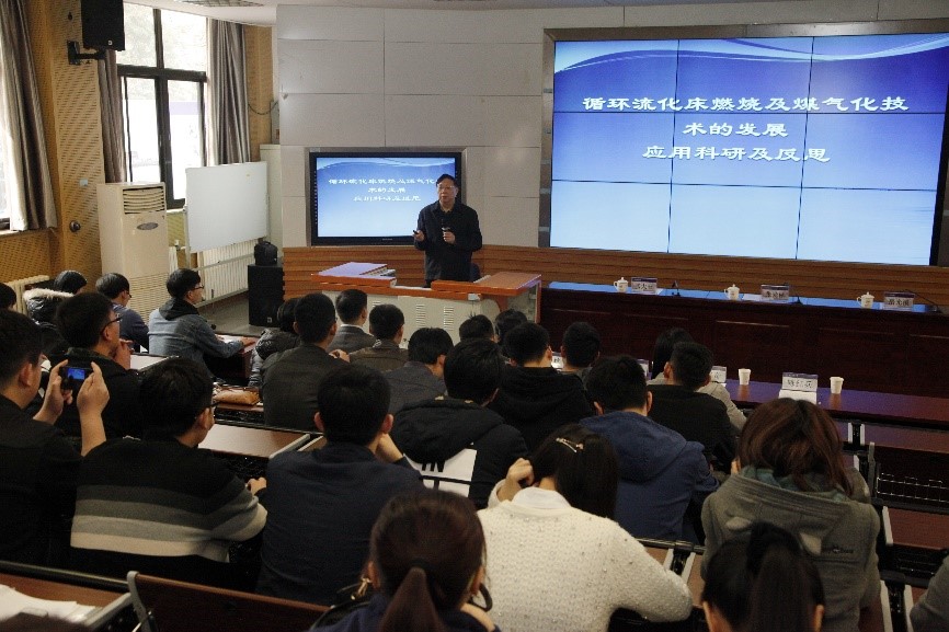岳光溪院士还为师生作了关于“应用科研及反思”的学术前沿报告,系统介绍了其在循环流化床燃烧及煤气化技术领域所取得的世界领先成果,用案例生动展示了科研过程中如何思考和解决问题,提出了科学研究时的“三个反思”,强调高校应以基础研究和应用研究并进,做好理论基础研究和长期积累的重要性,应借鉴和应用不同学科知识,拓宽研究的知识面,通过产学研紧密结合来实现技术的进步。在互动交流环节,岳光溪院士与我校师生进行了热烈的讨论,详细地回答了老师和学生提出的问题。整个讲座过程中,岳光溪院士渊博的知识、深入浅出的讲解及脚踏实地的科研态度给我校师生留下了深刻的印象。