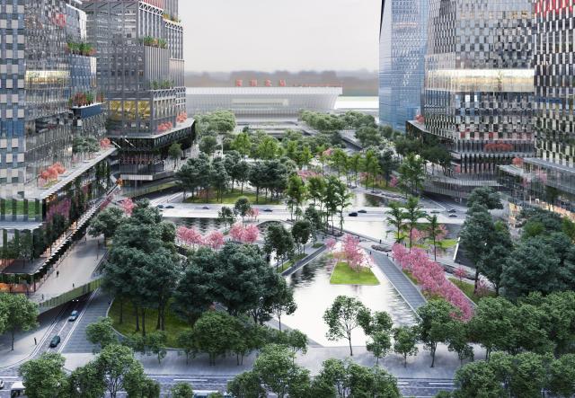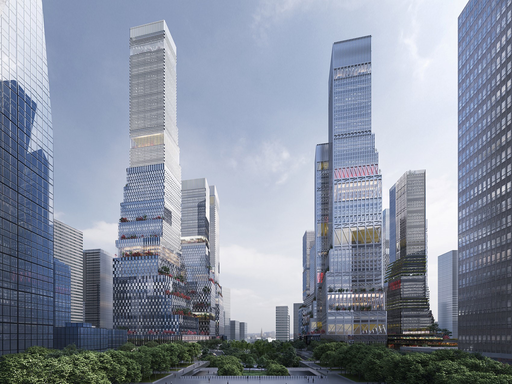 设计希望创造一个强烈的区域标识。商务区主要的建筑围绕一座中央城市公园设立,高度从278米到428米不等。主要的交通节点被设在地下,保证公共公园的开放性,弥补了该地区在开放的绿色空间方面的缺失。