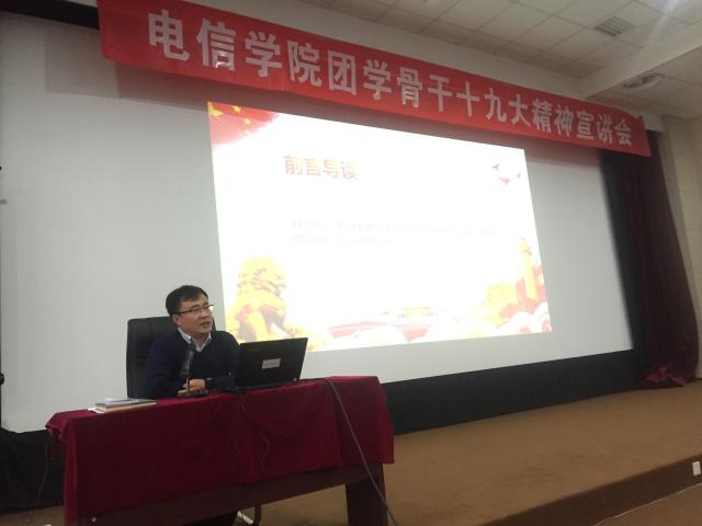 电信学院党委书记张雷作了“聚焦党的十九大”的报告。报告中,张雷精解了十九大报告,深化了同学们学习贯彻落实十九大精神的意识。他强调,党的十九大是在全面建成小康社会决胜阶段、中国特色社会主义发展关键时期召开的一次大会,作为大学生要认真学习贯彻落实十九大精神。