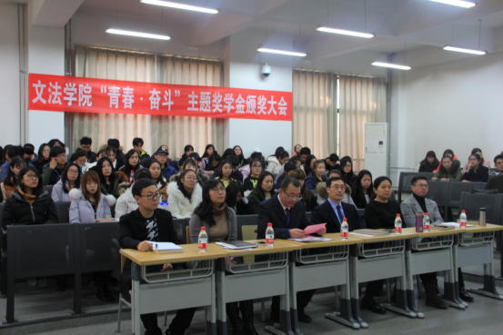 首先,李志国院长总结了2016-2017学年文法学院学风建设,并宣布我院120名学生获得国家级、校级、社会性质等奖学金名单。李院长说:“每位同学应该为自己喝彩,正在开展的教学审核式评估要求我们以评促改,以评促建,为自己成长作一砖一瓦的铺垫。这些获得奖学金的同学是全体同学的榜样。”之后,我院领导依次为获奖同学颁奖。
