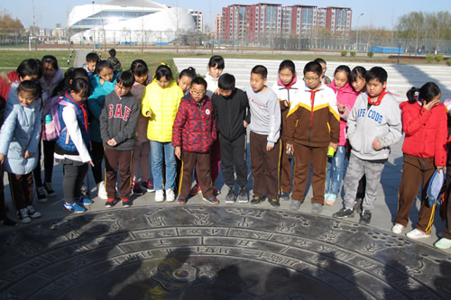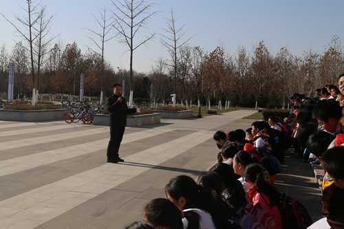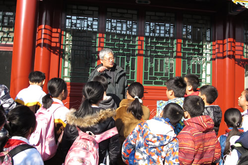 在馆外,原图书馆馆长王锐英老师,校纪委张瑶宁老师为嘉宾指导,在学生馆员董晨、王瀚星等同学的积极协助、带领小读者参观了我校大兴校区校园的建筑风格及功能布局,详细介绍了我校近年来在建筑遗产保护方面取得的成绩。在明湖之畔,王锐英老师生动讲解了北京四合院的建筑特色、格局及功能,并在鲁班文化广场,引导小读者们亲自体验了日晷和鲁班锁的巧妙之处。