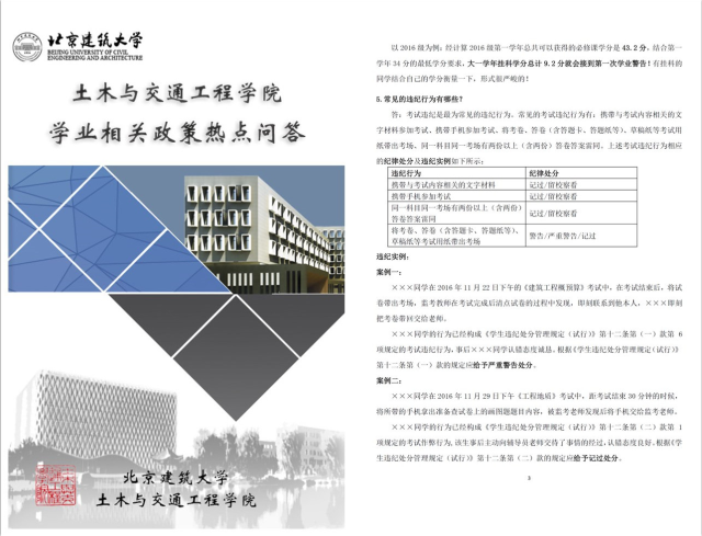 警钟长鸣,以案为鉴。学院印发《学业相关政策热点问答手册》至各宿舍,列举易犯的考试违纪行为与对应的纪律处分,并列举考试作弊实例作警示教育。此外,辅导员定期向全院学生通报学校发生的败坏学风实例,以示校院两级对违纪行为的零容忍,予以警示。