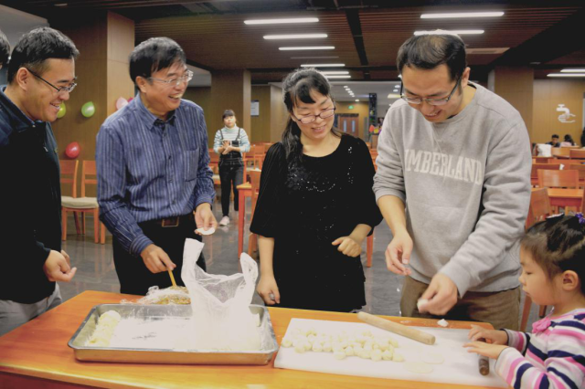 活动期间还准备了精彩的包饺子比赛,大家按照分组派代表,随着主持人展开包饺子速度赛和创意拼图赛,在规定时间内包出最多最好看的饺子、摆出特色图形,同时老师们也加入比赛的行列,师生合作,各尽所能,为自己小组争取积分,将活动氛围推向高潮。