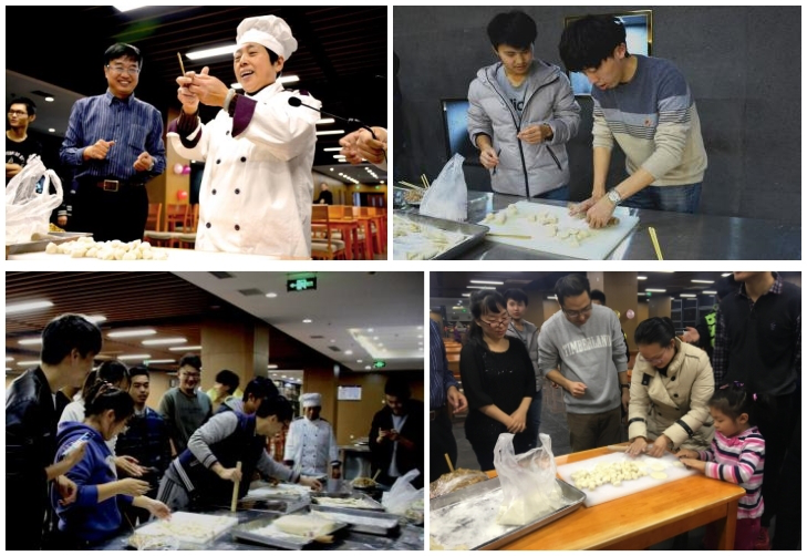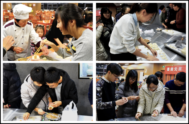 臻园食堂洋溢着浓浓的节日氛围,活动伊始,车晶波老师为大家总结土木学院2017年在学生工作上的“六大突破”,并寄语同学们在未来的学习生活中,参与到学院的发展中来,发挥自身才干,早日成才。随后,主持人邀请食堂师傅给大家讲解包饺子的小技巧,同学们都聚过来认真领会,老师们也忍不住与师傅一同展示自己深藏不露的拿手活。大家互相交流学习包饺子,董军教授还用材料力学的知识为大家分析擀皮的原理,现场气氛逐渐升温。大家一边包饺子,一边话新年,餐厅里不时回荡着欢声笑语,气氛愉快而活跃,同学们感受到家一般的亲切和温暖。