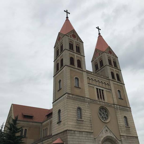 此时的青岛已经染上了秋天的凉意,天空也铺上了灰色的调子。我第一站来到了青岛的圣弥厄尔教堂。以灰色的天空作为北京,圣弥厄尔教堂给人气势庞大却又古朴典雅的感觉。一时间,我们同行之人情不自禁止住了说话的声音,开始静静抬头仰望这座伟大的建筑物。看惯了中式的木质结构房屋,来到石质的西式建筑面前,我们不得不感叹从那些冰冷却庄严的石墙纹路中透露出的风霜的印记是如此的真实,刻骨铭心。哥德式和罗马式的建筑风格将最典型的欧式建筑展现在我们面前。红色的尖顶为这个教堂增加了点睛之笔,那抹飞扬的色彩让整个建筑物庄严之中又不古板。