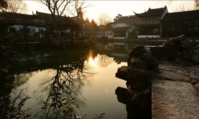 园以景胜,景因园异,如拙政园以水见长,环秀山庄以山独步,而留园则山石水池外,更以建筑群的巧妙安排与华丽深幽著称。留园又称寒碧山庄,同治间盛旭人购得,重加扩建,修葺一新,取留与刘谐声改名留园。俞樾作《留园记》,称其为“吴下名园之冠”。园占地约二公顷,分为四个景区;中部以山水见长,东部以庭院取胜,北部为田园风光,西部具山林野趣。该园以建筑群划分空间,厅堂建筑宏敞华丽,庭园造景富有变化,尤以花石著称,有“不出城廓而获山林之趣”。