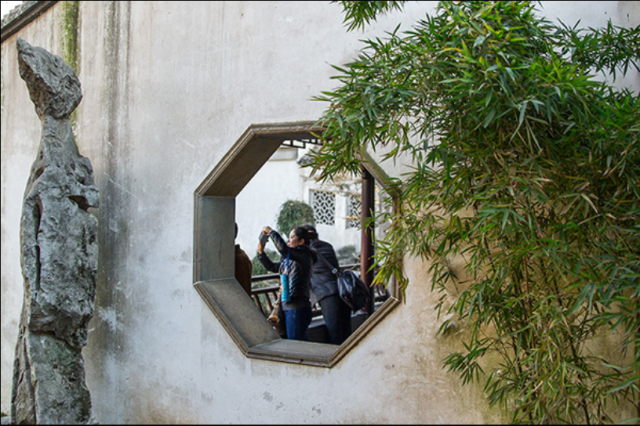 在园林中穿行,这两点可能是一个游客最大的感受。留园东区大部分都是建筑,在建筑中穿行,一方面曲折的变化以用空间的多变性带来的乐趣可能是让建筑不单调的一个方面,当然,如果除去这一方面,园林还在很多的小的方面给了我们一些特有的情绪。比如,在一条长长的走廊上行走,如果两边都是墙的话,人会很乏味,然后,园林会在这时在走道的一侧嵌入一个小小的露天景观小品,中间可能是种上一颗树,可能是有一块形状奇异的石头,这些都为在走道中行走时提供了不小的乐趣。而且,这样一种方式所形成的不仅仅只是乐趣,这样的小品对于空间也有一定的阻隔效果,视线不能透过他去看到对面,这样为园林多变空间的塑造作下了一定的贡献。框景自然也是园林中必不可少的部分,甚至可以说,框景是园林的一部分灵魂所在,有了框景,空间有了渗透,有了框景,视线产生了多条路径,有了框景,行走多了趣味……