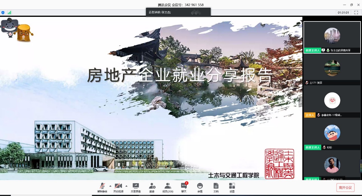 张士杰结合疫情影响,从经济的角度简单介绍了房地产行业的现状、房地产项目的流程、岗位、各个部门的工作内容。着重介绍了对于应届毕业生,如何选择企业与岗位、简历制作及相关面试经验。同时也指出了地产行业的竞争性,有些地产企业甚至要面试七轮才能最终被录取,这就要求同学们要不断提升个人能力,在未来的竞争中脱颖而出。