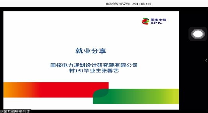 张馨艺从就业渠道、就业选择、就业心态三方面向同学们分享自己的就业体会,并提出了相关的建议总结:?提前准备,不打无准备之仗;?盯紧目标,不要左右摇摆;?充实自己,加分项很重要;?不要迟到、面试第一印象很重要;?准备好简历和良好的心态,自己的人生要把握好。她还着重强调了找工作签约时须谨慎,要“想明白,再签约,不后悔。”