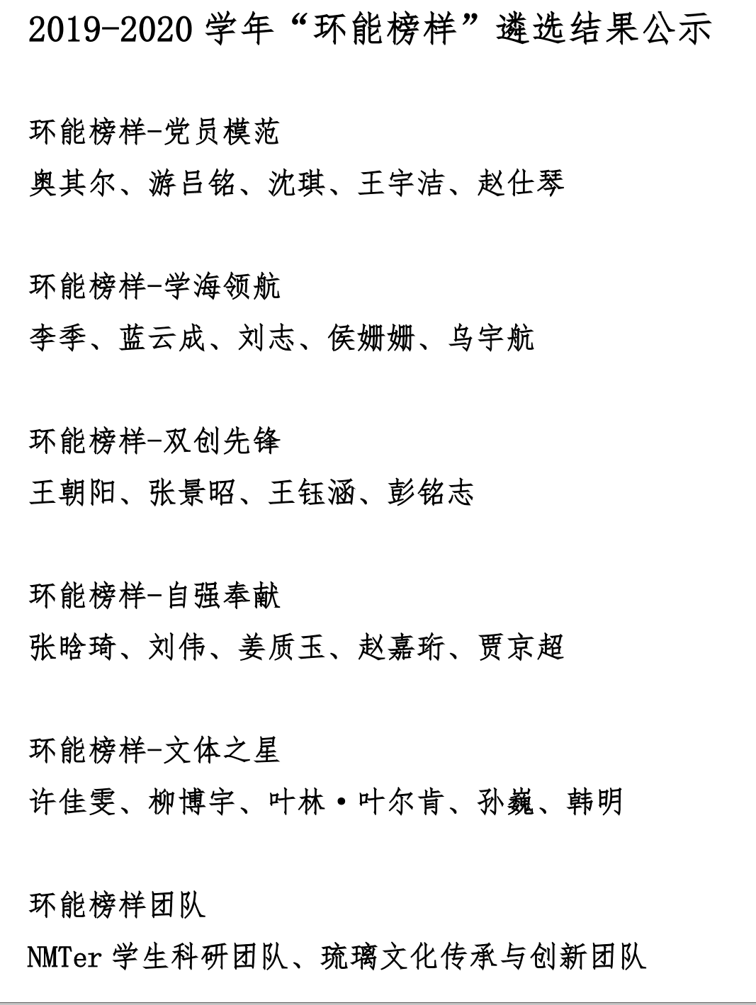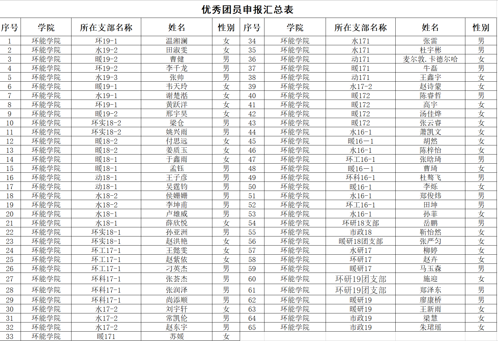 按照学校及学院各项评审条件及规定,学院团委坚持公平、公正、公开的原则,在全院39个团支部民主推荐和认真研究的基础上,评选结果报学院党政联席会审议通过,最终7个团支部推荐为“优秀团支部”,3个团日活动推荐为“最佳团日活动”,“优秀团员标兵”推荐8人、“优秀学生干部”推荐24人、“优秀共青团员”推荐65人。“环能榜样-党员模范”、“环能榜样-学海领航”、“环能榜样-双创先锋”、“环能榜样-自强奉献”和“环能榜样-文体之星”共推荐24人。名单如下: