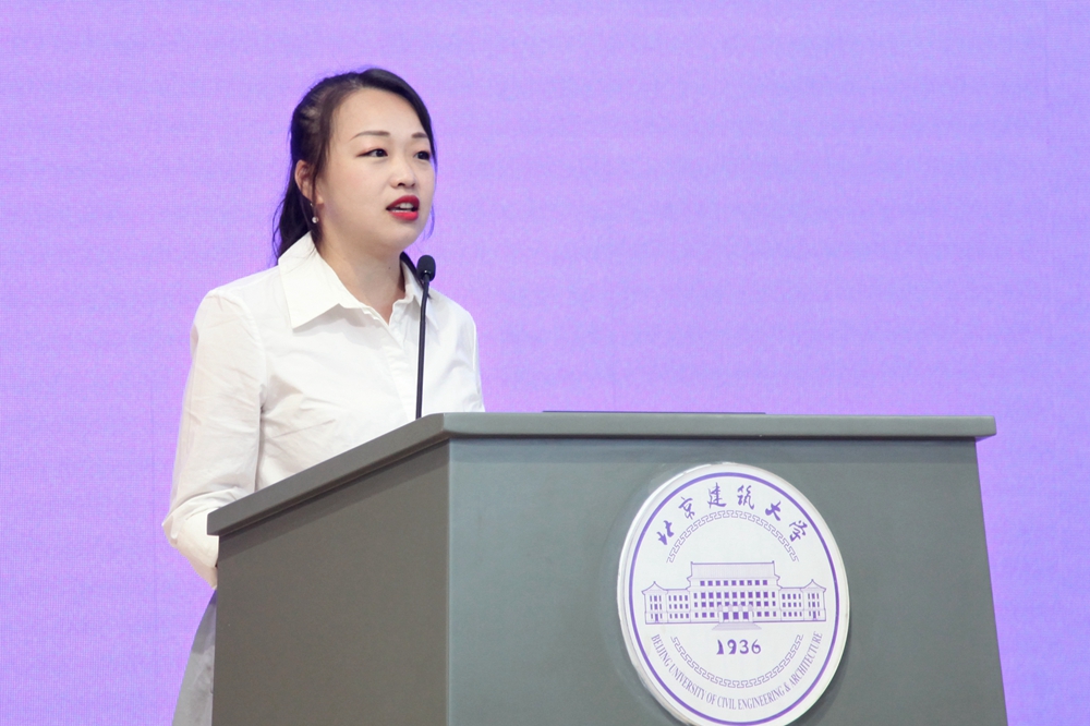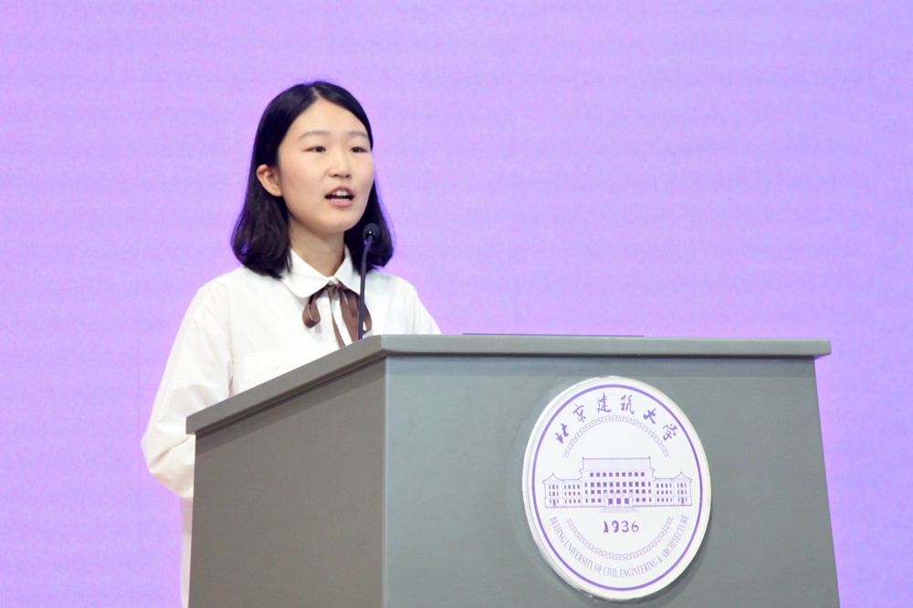 本科新生代表经管学院栾心雨代表全体新生畅谈大学理想,并号召大家践行北建大“实事求是、精益求精”校训,规划好自己的大学学习生活,勇敢的追求青春梦想。