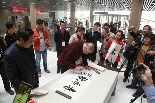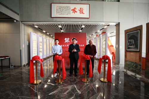 校党委书记王建中,中国书法家协会会员、长白书画研究会副会长、我校工民建专业1952级校友爱新觉罗.启骧以及学生作者代表、2017级环能学院研究生陈旭共同为本次展览剪彩。