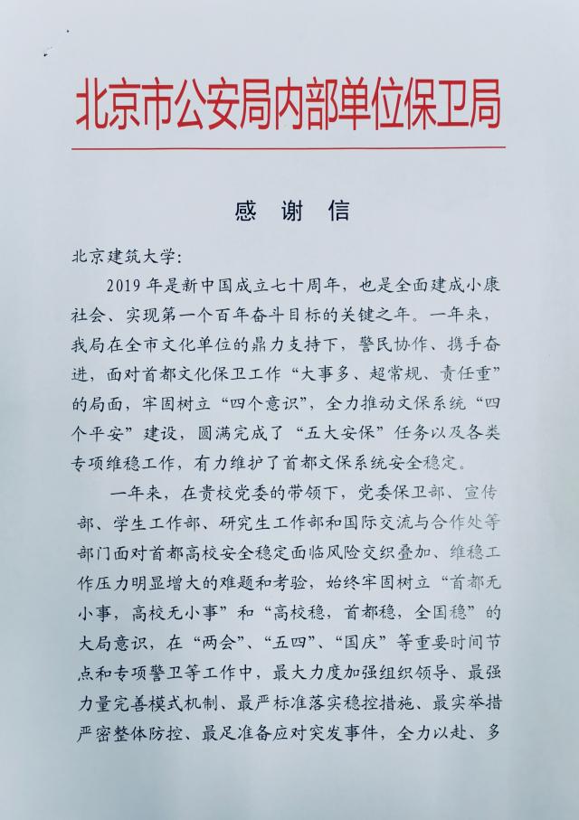 感谢信中提到,我校在首都文化事业建设中讲政治、讲大局、讲协作;在发展和推动教育事业中主动作为、迎难而上;在深化“平安高校”建设中全力以赴、担当有为,有力维护了首都文保系统安全稳定。