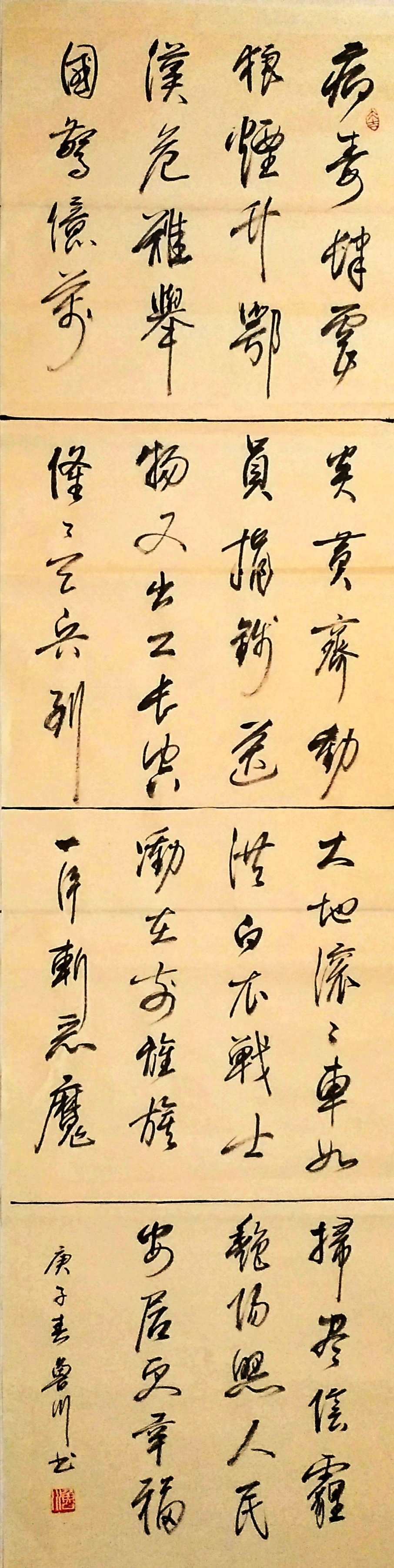 作品介绍:病毒肆虐狼烟升,鄂汉危难举国惊。亿万炎黄齐动员,捐钱捐物又出工。长空隆隆天兵到,大地滚滚車如洪。白衣战士冲在前,旌旗一片斩恶魔。扫尽阴霾艳阳照,人民安居更幸福。