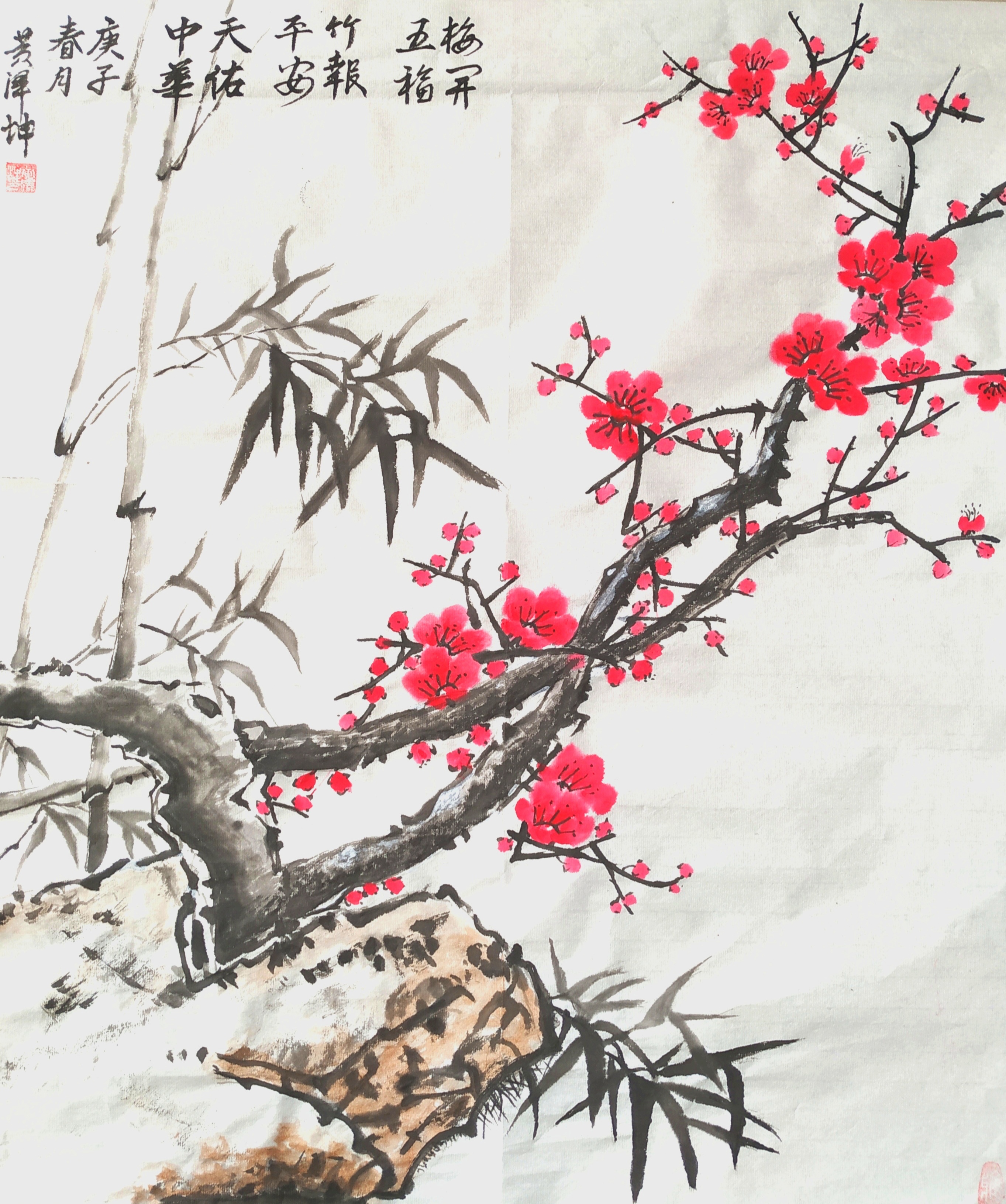作品介绍:梅开五福,竹报平安,天佑中华。