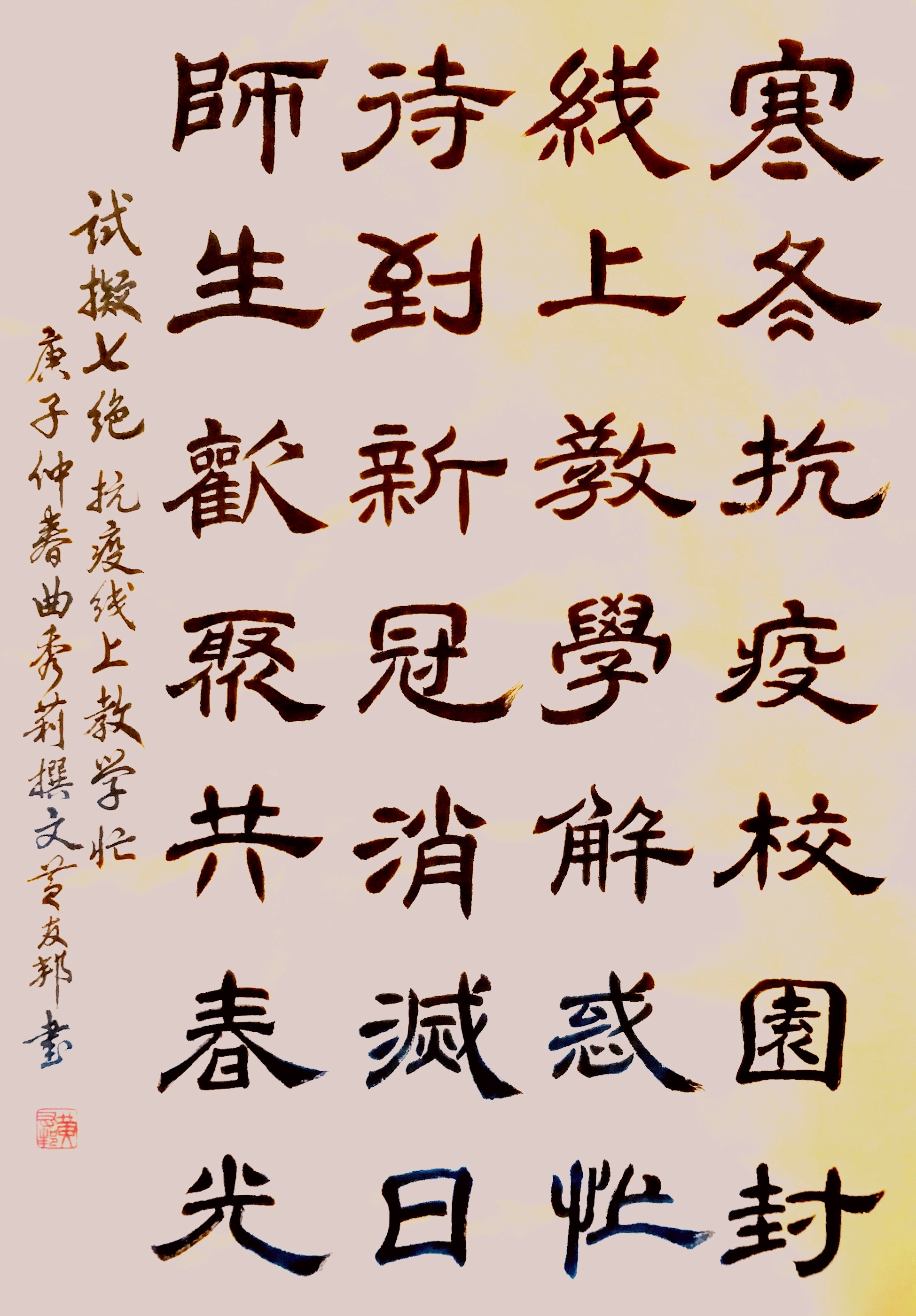 作品介绍:寒冬抗疫校园封,线上教学解惑忙。待到新冠消灭日,师生欢聚共春光。