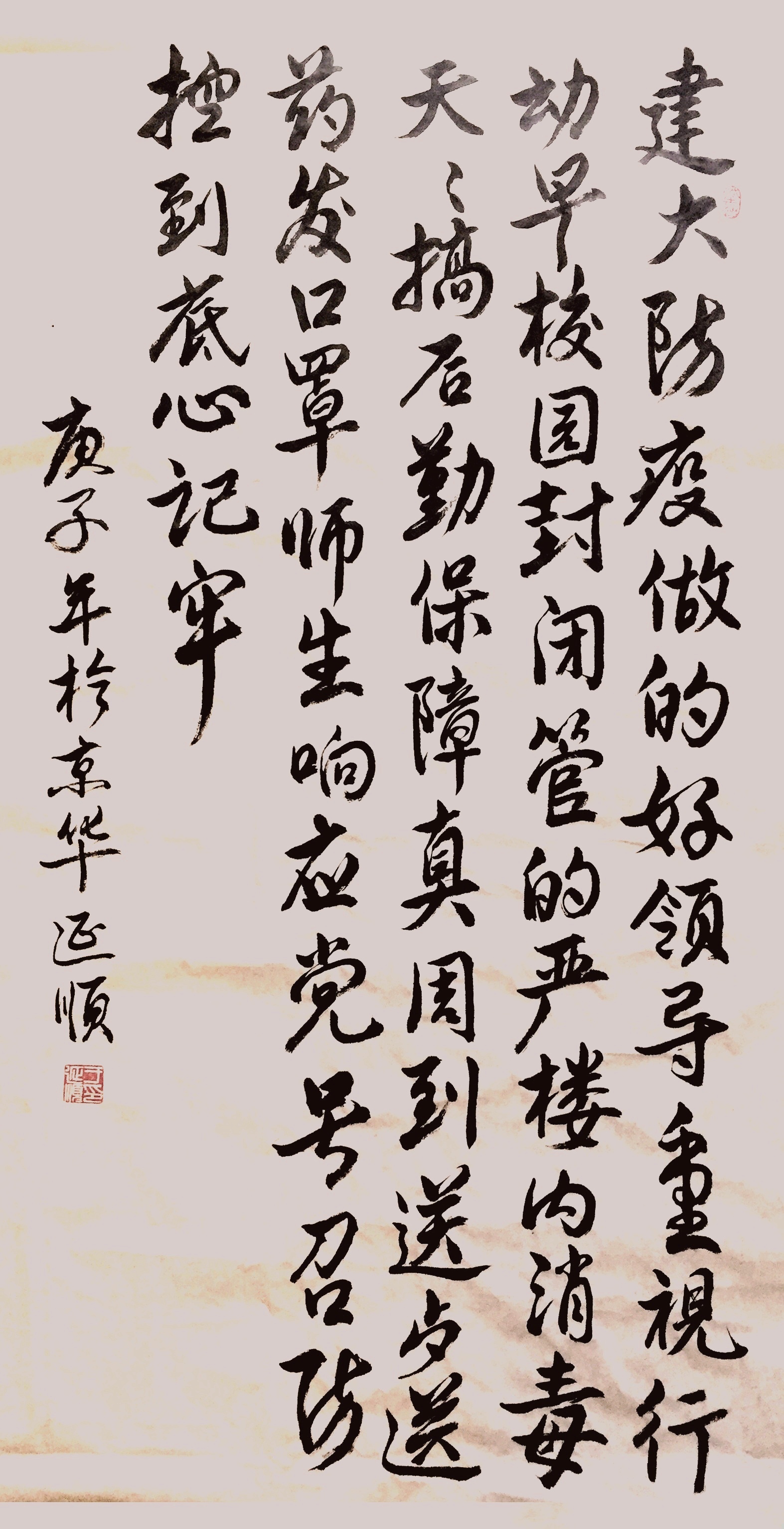 作品介绍:建大防疫做的好,领导重视行动早。校园封闭管的严,楼内消毒天天搞。后勤保障真周到,送餐送药发口罩。师生响应党号召,防控到底心记牢。