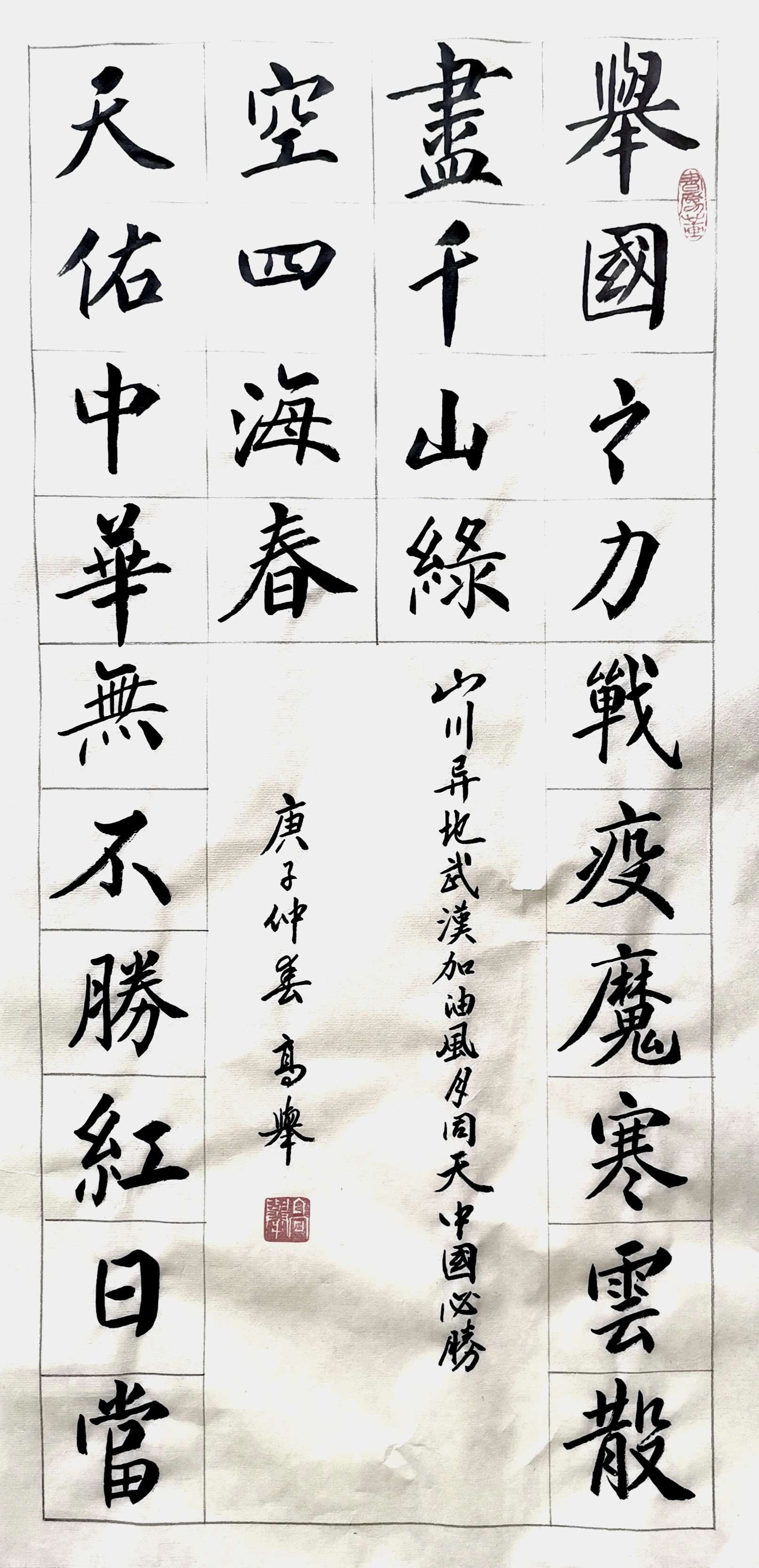 作品介绍:举国之力战疫魔寒云散尽千山绿,天佑中华无不胜红日当空四海春。山川异地武汉加油,风月同天中国必胜。