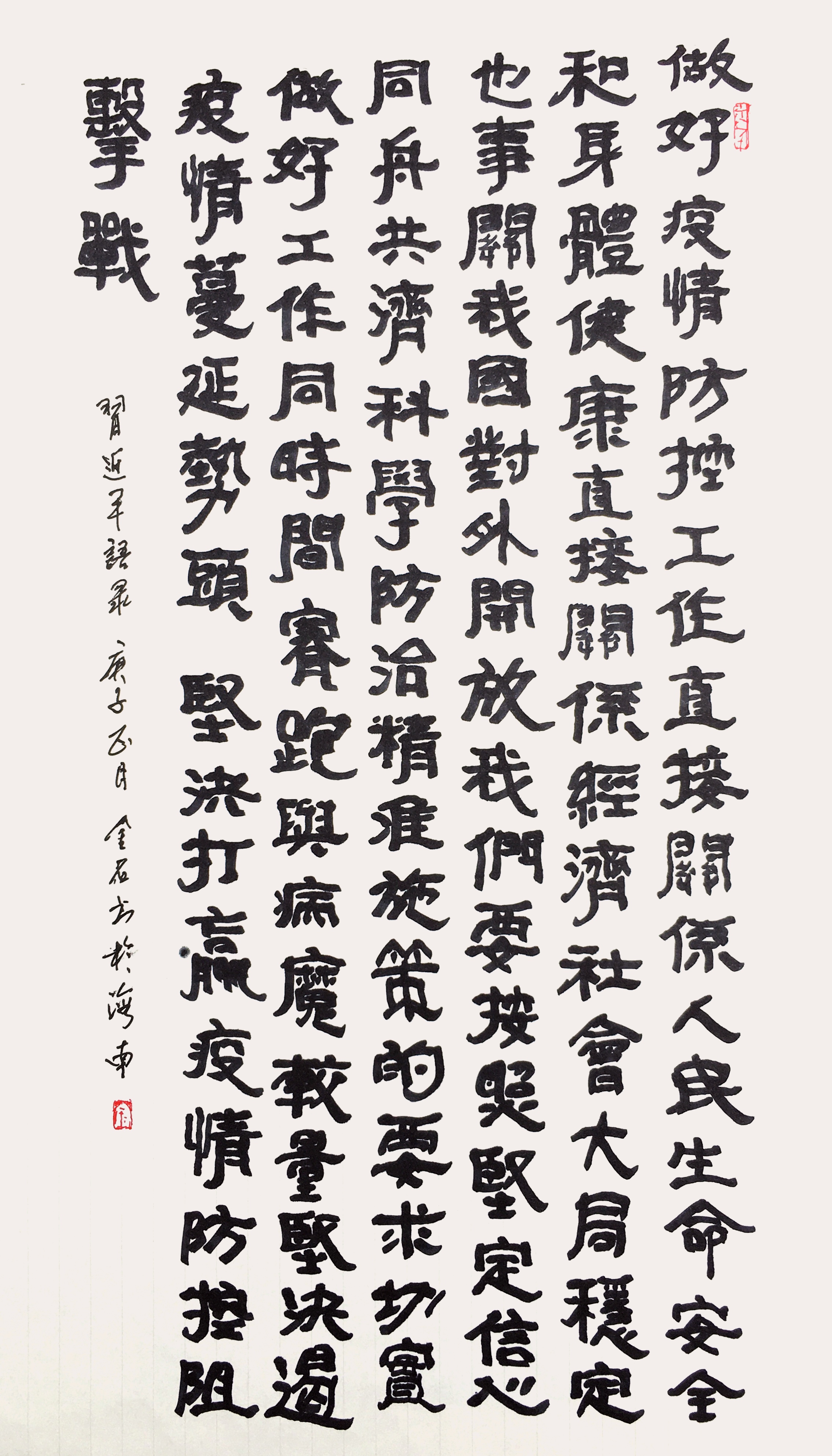 作品介绍:抄录习近平讲话:做好疫情防控工作,直接关系人民生命安全和身体健康,直接关系经济社会大局稳定,也事关我国对外开放。我们要按照坚定信心、同舟共济、科学防治、精准施策的要求,切实做好工作,同时间赛跑、与病魔较量,坚决遏制疫情蔓延趋势,坚决打赢疫情防控阻击战。