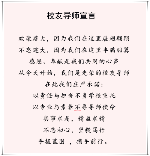 “欢聚建大,因为我们在这里展翅翱翔;不忘建大,因为我们在这里丰满羽翼;感恩、奉献是我们共同的心声;从今天开始,我们是光荣的校友导师。在此我们庄严承诺:以责任与担当不负学校重托;以专业与素养不辱导师使命;实事求是、精益求精;不忘初心,坚毅笃行;手握蓝图 ,携手前行。”铿锵有力的词句与慷慨激昂的朗诵交融,迸发出对母校的感恩之情,青春的激情感染了在场的所有人。